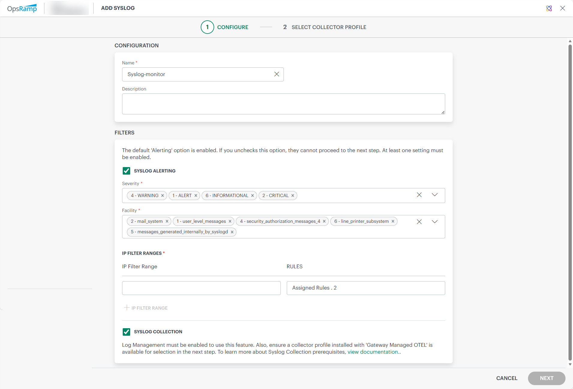 Syslog messages having selected severity level will only be processed. Rest of the messages will be dropped.FACILITY Dropdown (required) Type of message to monitor dropdown from RFC 5424.