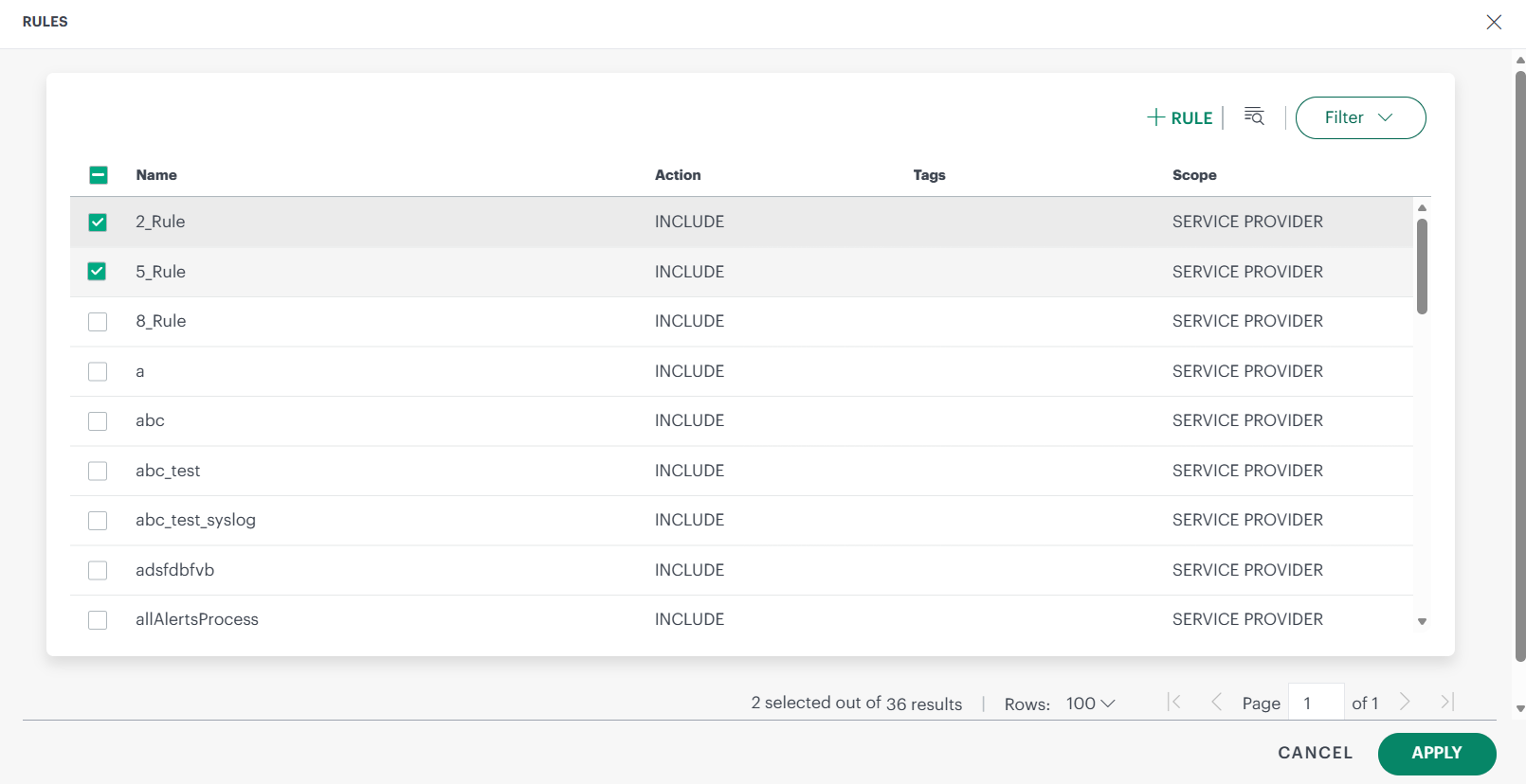 Field Name Field Type Description Name String (required) Rule name. Action Dropdown (required) Action to apply to messages that match this rule: - INCLUDE: If the event matches a rule, it is processed further.