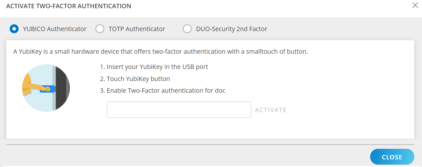 - Click ACTIVATE. The ACTIVATE TWO-FACTOR AUTHENTICATION dialog box is displayed.