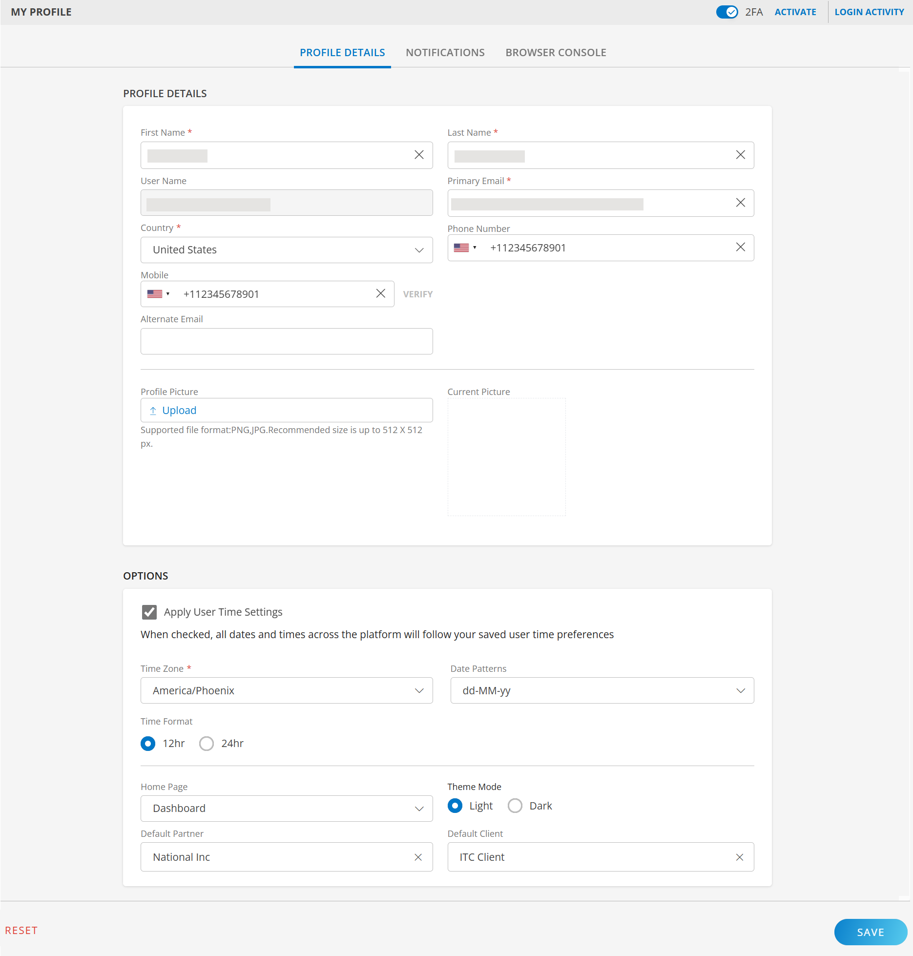 - Profile Details: Allows you to view and update your personal information such as Name, Primary Email, Phone number, preferred home page, Time Format, and other relevant information.