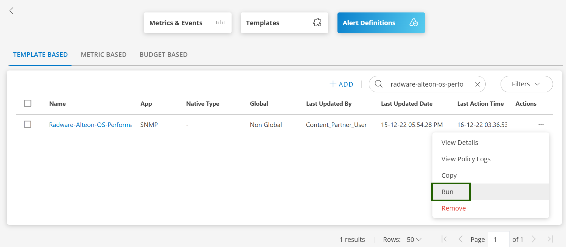 - Click RUN to confirm. The alert definition executes immediately on the associated resources.