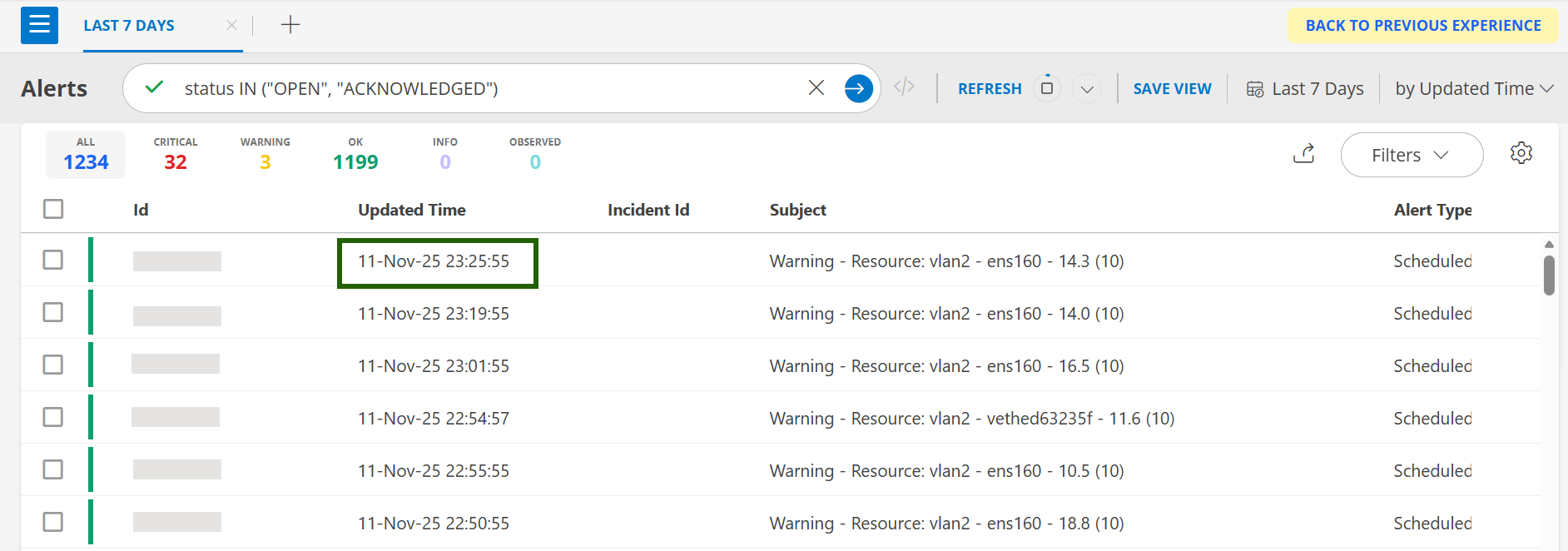 The following example illustrates how a user’s configured time zone and date-format preferences are applied to the Alerts listing page. These changes are visible only to that user and do not affect how other users view alerts.