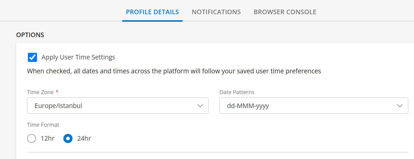 Note: The preferences you configure in My Profile determine how dates and times are shown to you across the platform. These are unique to your account and do not affect how other users see date and time information. Other users will see dates and times based on their own settings or the system defaults.